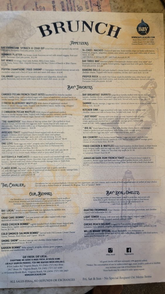 Welcome to Bay Local Eatery, a delightful gem on Shore Drive in Virginia Beach, offering a vibrant twist on American breakfast and brunch. The menu is a treasure trove of flavors, catering to diverse tastes with an array of vegan and vegetarian options. Start your meal with the Loaded Hand Cut Bay Tots, paired perfectly with spicy Cajun aioli. For something light and refreshing, the Bay Local Salad brings together fresh greens and sweet cranberries with a delightful dressing selection.